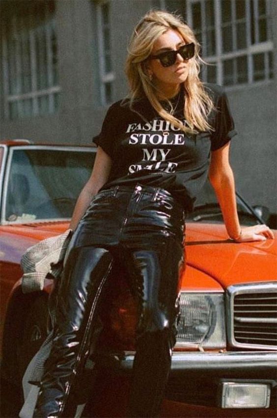 O verniz já remete ao um look mais sexy, você pode quebrar essa sensualidade usando com uma camiseta básica interessante e estará pronta para a balada.