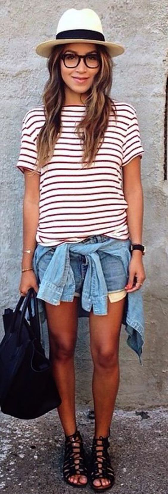 Durante o dia, adoro as camisas jeans com o tecido mais leve. Ficam lindas com um nó na ponta.