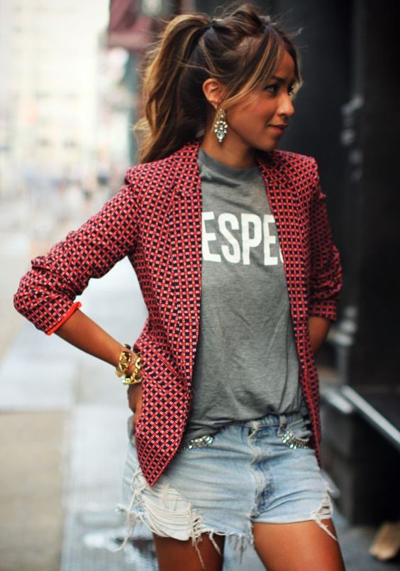 Um shorts jeans com um uma camiseta descolada e um super blazer, é estilo na certa!
