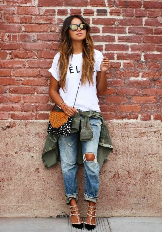 Jeans destroyed com uma camiseta descolada e um belo salto é garantia de um look arrasador.