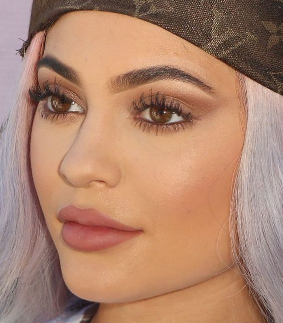 Kylie adora tons neutros e terrosos. Nessa maquiagem, o delineado marrom e os cílios cheios ganharam destaque. A pele ganhou um toque matte e não poderia faltar o famoso contorno muito usado pelas Kardashian/Jenner.