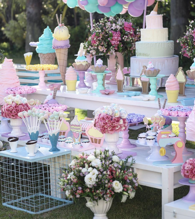 O dia estava lindo e a decoração mais ainda! O tema foi SORVETE, todo inspirado nas candy collors, que é o mesmo tema que escolhemos para o quartinho das meninas!