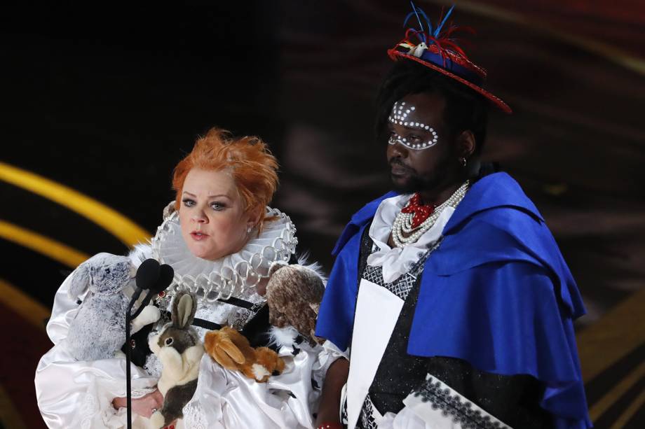 O prêmio de melhor figurino, apresentado por Melissa McCarthy e Bryan Tyree Henry, arrancou risadas da plateia pelas roupas, que misturavam elementos de todos os indicados, como O Retorno de Mary Poppins, Pantera Negra e Duas Rainhas.