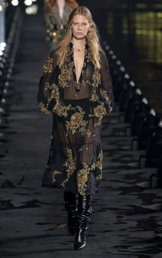Na sétima posição da lista, temos uma das grandes apostas dos designers mais modernos, que são os tecidos transparentes. Mas calma, se não se sente à vontade de usar um vestido todo transparente, há também a opção das mangas bufantes transparentes, estilosas na sua medida.