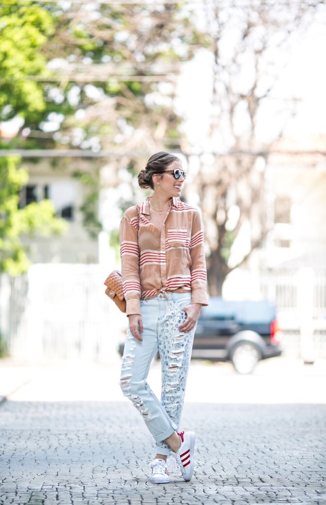 Escolhi um look bem despojado e confortável para o primeiro dia de São Paulo Fashion Week. Calça boyfriend (amo/sou) + tênis (amo/sou) + camisa com listras (vício total). Parece uma combinação...