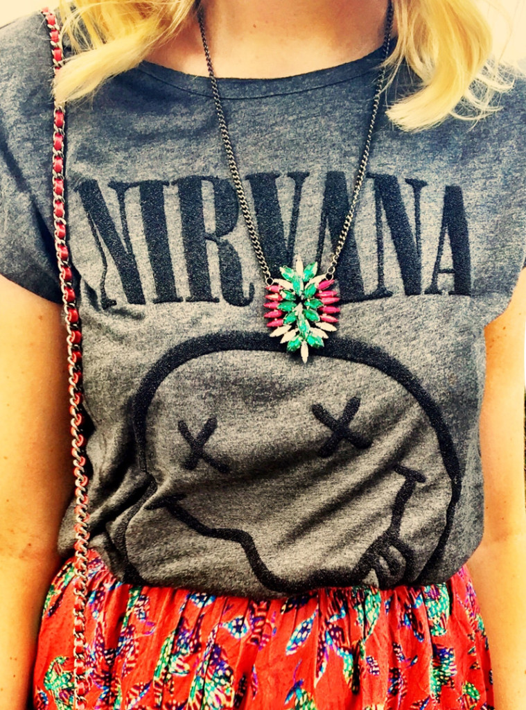 Adoro misturar estilos… Sair do óbvio! Nesse look misturei a Tee super rocker do Nirvana, com a saia midi floral com fendas, e AMEI o resultado! Usei para um almoço...