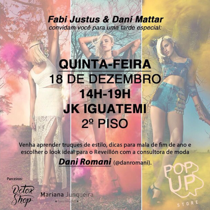 Meninas, amanhã eu e a Dani Mattar estaremos na Pop Up Store do JK, pois teremos um eventinho gostoso, com sucox detox, docinhos e a Personal Stylist Dani Romani dando...